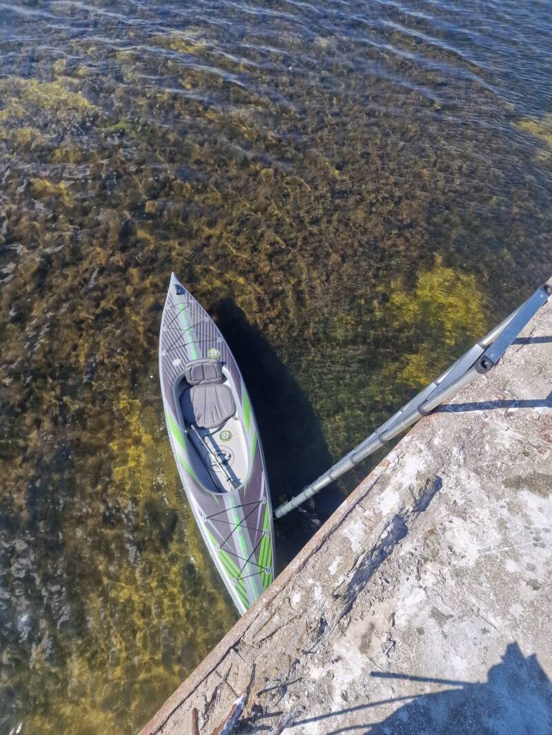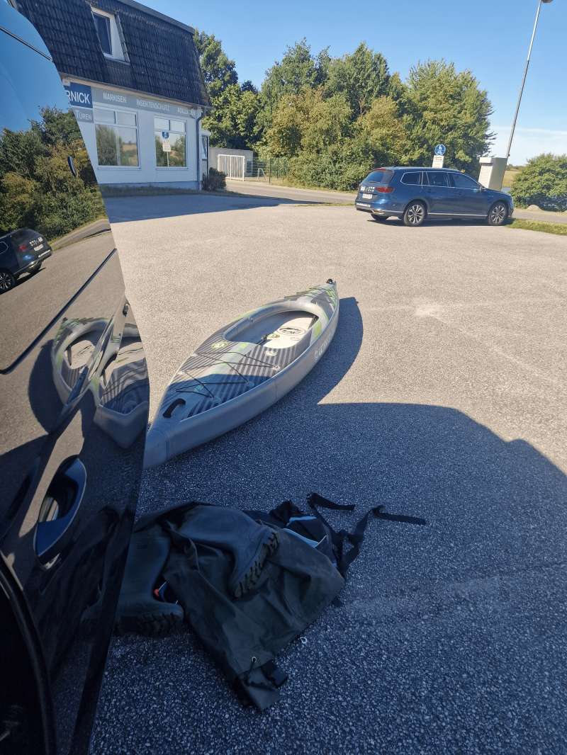 Am 8.9. war es so weit, dass ich das Beton-Schiff bei Redentin besuchen wollte. Nach kurzer Suche nach einem geeigneten Parkplatz hatte ich einen Plausch mit einem Mitarbeiter einer ansässigen Firma. Und nach einer kleinen Spende in die Kaffeekassen konnte ich mein Auto für unbegrenzte Zeit sicher auf dem Firmenparkplatz abstellen. Von dort aus ging es dann der roten Linie am Ackerrand in Richtung Wasser. Ganz einfach war es in Bezug auf meine Ausrüstung dann aber doch nicht. Das ganze Gedöns musste ja erst einmal ans Wasser bugsiert werden. Und alleine ist das gar nicht so geil. Aber gut, letztendlich hatte ich es dann auch geschafft. An das Zurückschleppen wollte ich in diesem Moment nicht denken. Um das ganz Zeug nicht auch noch durchs Wasser zu schleppen, hatte ich natürlich mein Kajak mitgenommen. Das war dann auch wirklich hilfreich. Also Kajak wurde beladen und abging es in Richtung Dose.